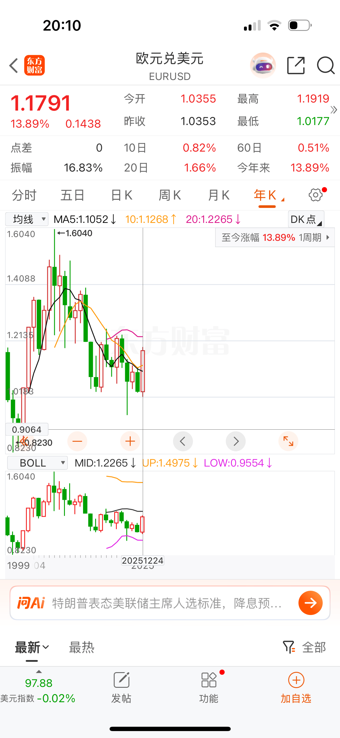 今年以来欧元对美元涨幅13.89%