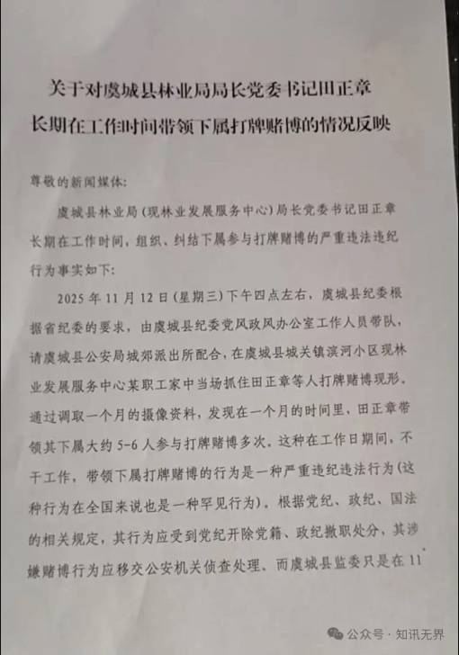 “作为部门‘一把手’,本该在岗位上履职尽责,却在工作日聚众赌博,这让群众怎么看?” 提及此事,当地不少群众直言不满。根据反映材料,2025 年 11 月 12 日 16 时许,虞城县纪委遵照河南省纪委工作要求,联合县公安局城郊派出所组成核查组,在县城关镇滨河小区林业局工作人员韩某涛家中,当场查获田某章与两名下属正在参与赌博,现场固定的视频、照片等资料清晰锁定了违纪事实。