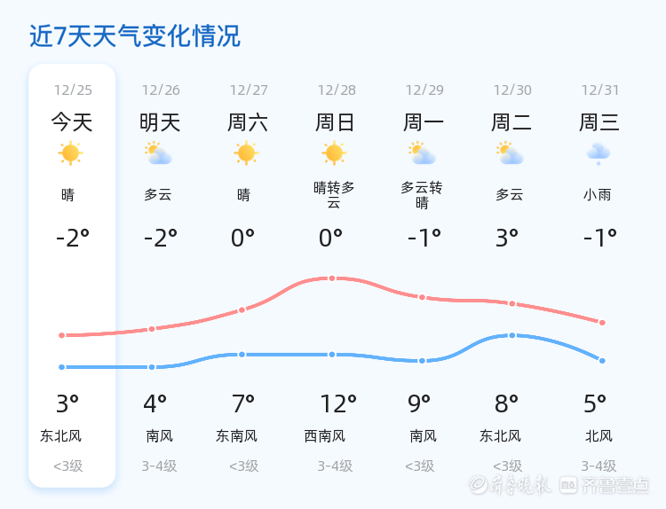 今天是12月25日,农历十一月初六,星期四。菏泽市迎来晴朗天气,全市气温较为平稳,最高气温为3℃,最低气温为-2℃。目前,菏泽市气温为-0.7℃,天气晴朗,北风2级,空气湿度为62%,PM2.5指数为113。各区县天气情况基本一致,均为晴朗天气,气温略有波动,但整体变化不大。