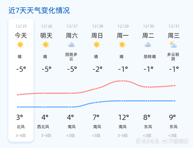 今天是12月25日,星期四,农历十一月初六。枣庄市迎来晴朗天气,气温范围在-5℃到3℃之间。全市各区天气状况一致,均为晴天,北风1级,空气湿度为59%,PM2.5指数为69,整体空气质量良好。市民朋友们可以在阳光明媚的天气中享受冬日的宁静与美好。