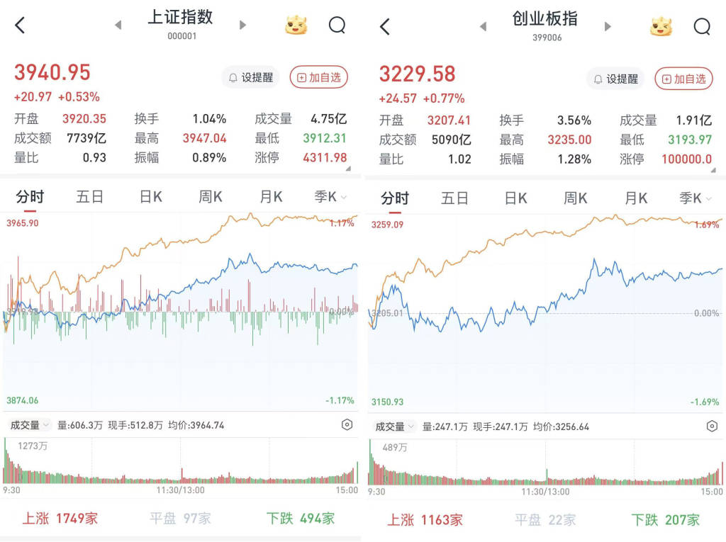 至收盘,上证综指涨0.53%,报3940.95点;科创50指数涨0.9%,报1352.13点;深证成指涨0.88%,报13486.42点;创业板指涨0.77%,报3229.58点。