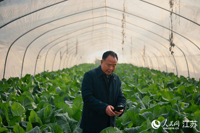 周相民在大棚内操作手机,就能对科技蔬菜大棚的进行各种设置。 人民网记者 鞠峰摄