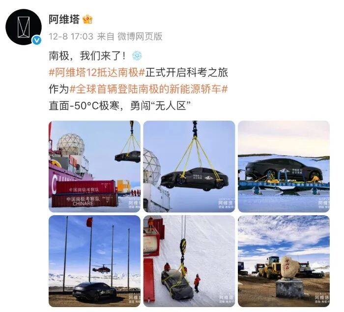 就在12月初,阿维塔曾官宣阿维塔12抵达南极中山站,称其为“全球首辆登陆南极的新能源轿车”,将“直面-50℃极寒” 开展科考测试。