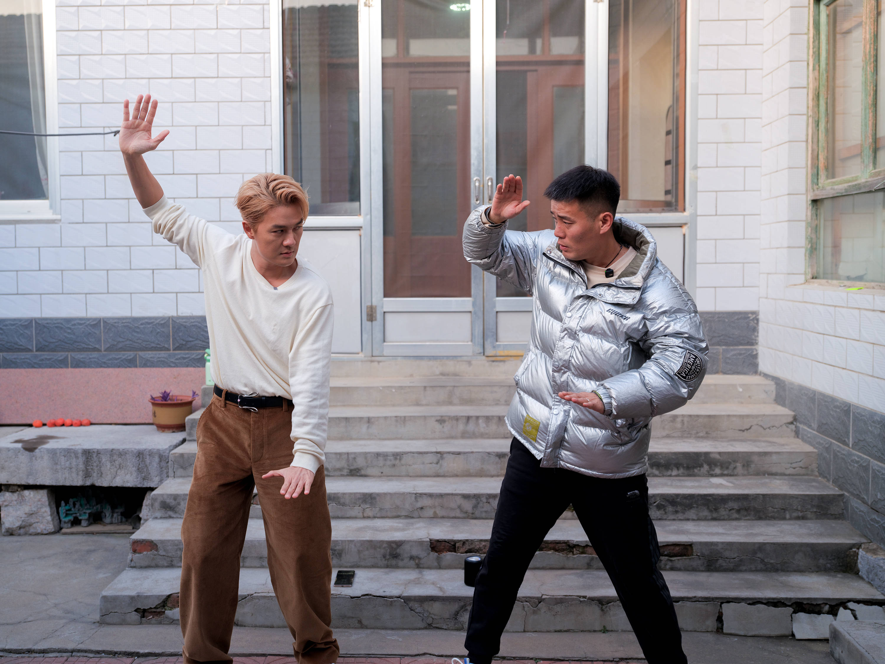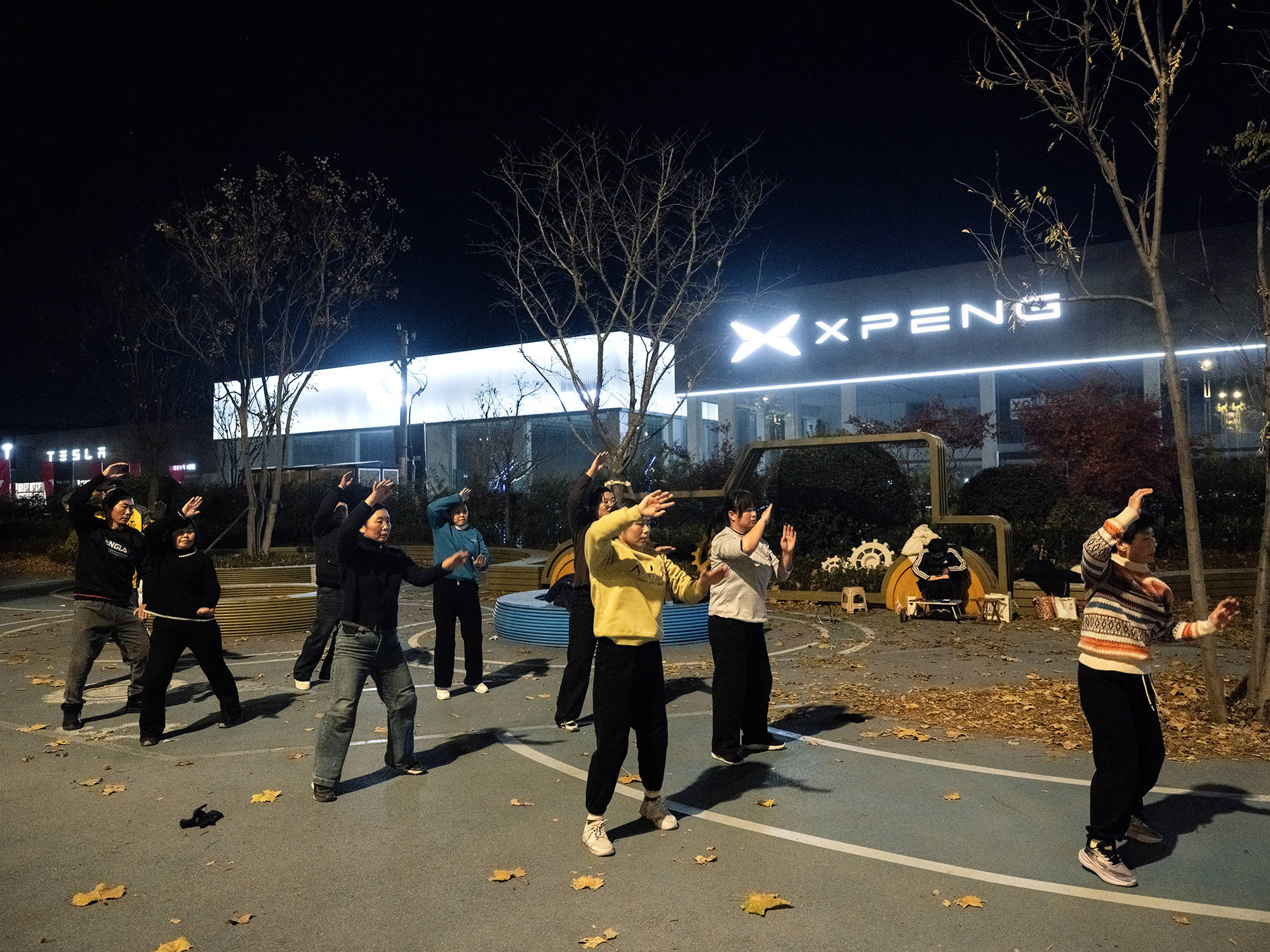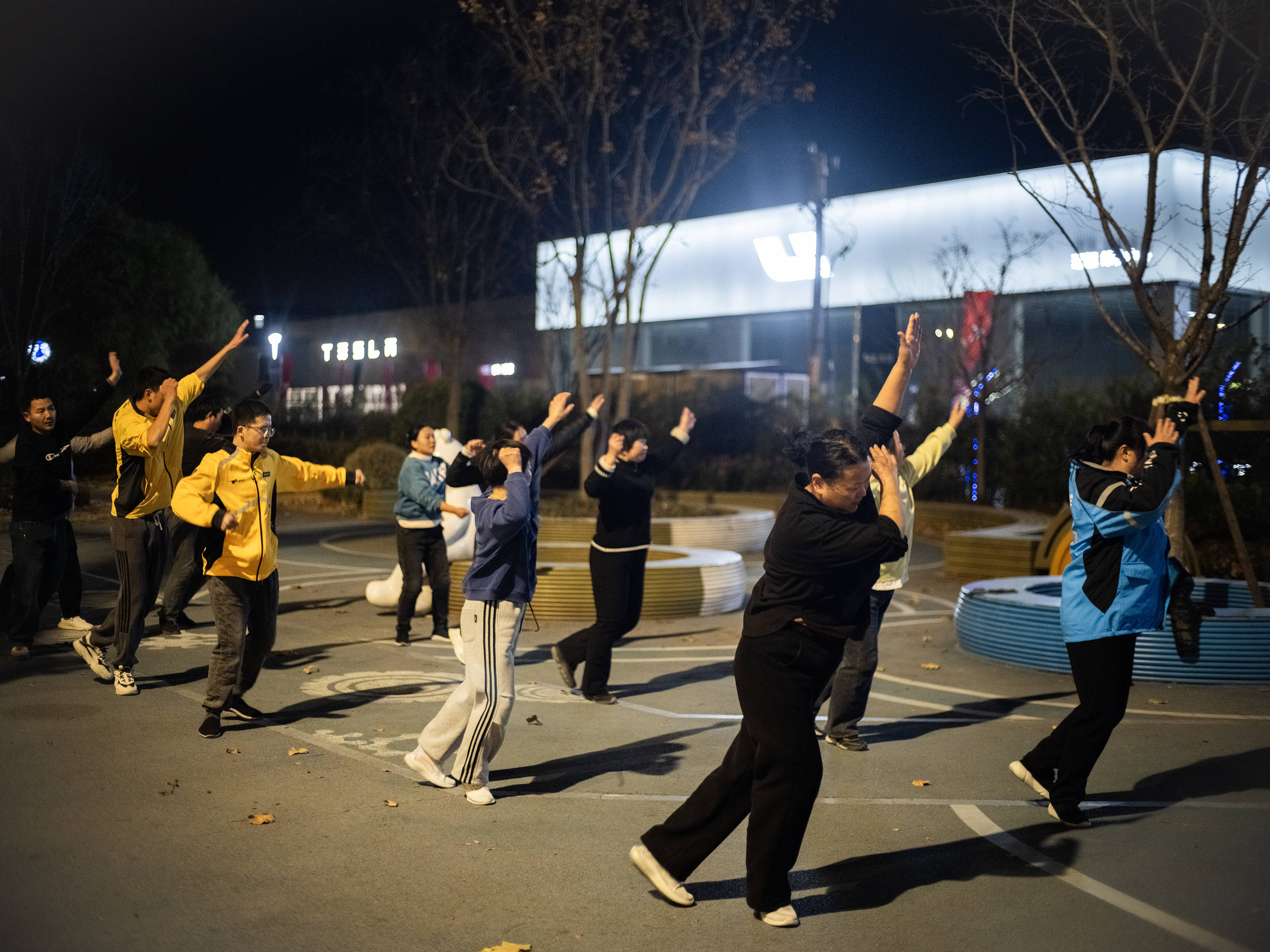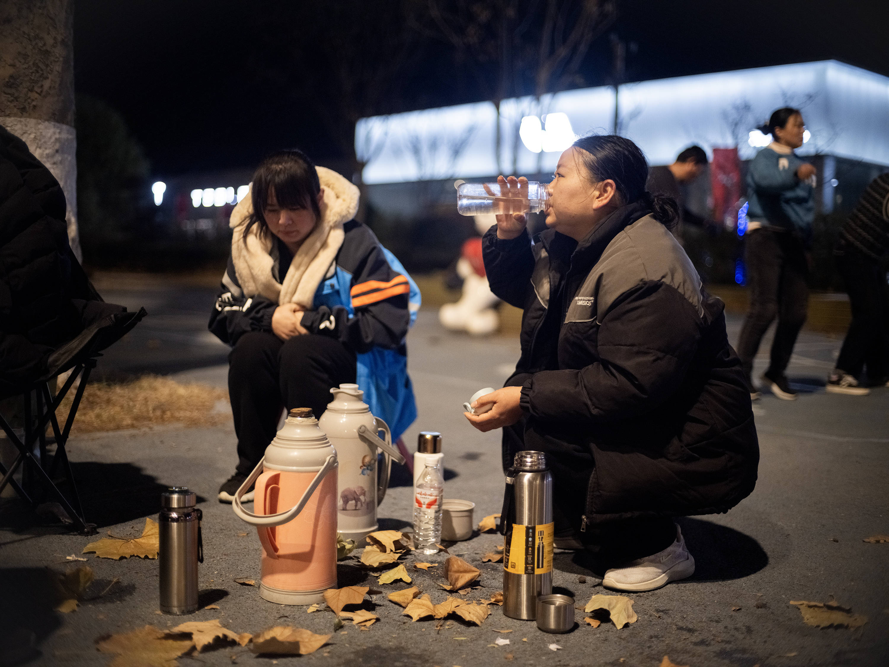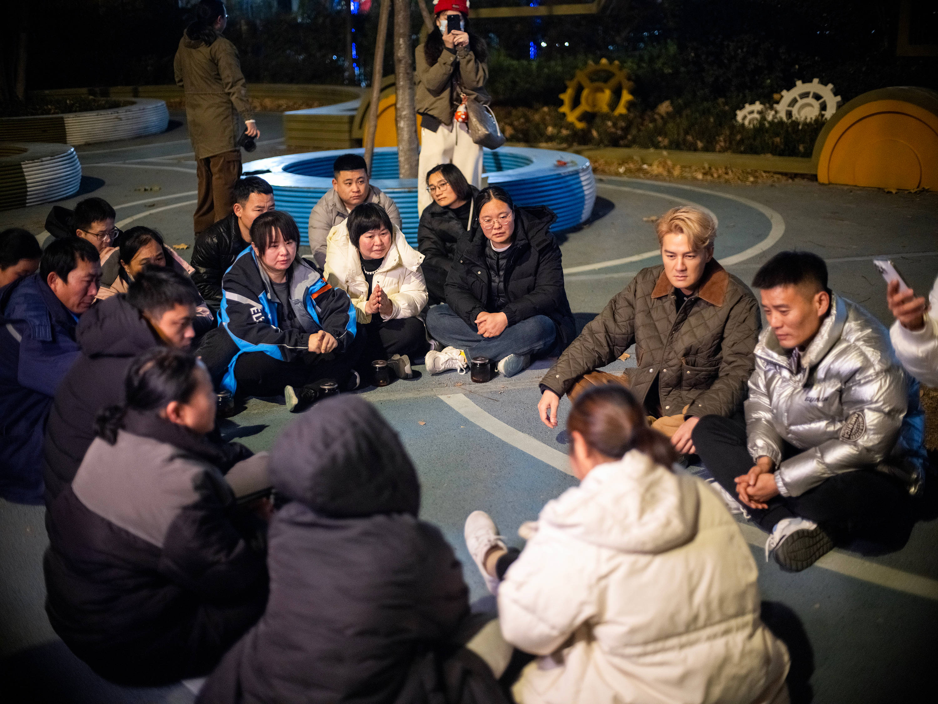 跳舞的人分为两组,一组跳完后立刻穿上外套,在路边休息。