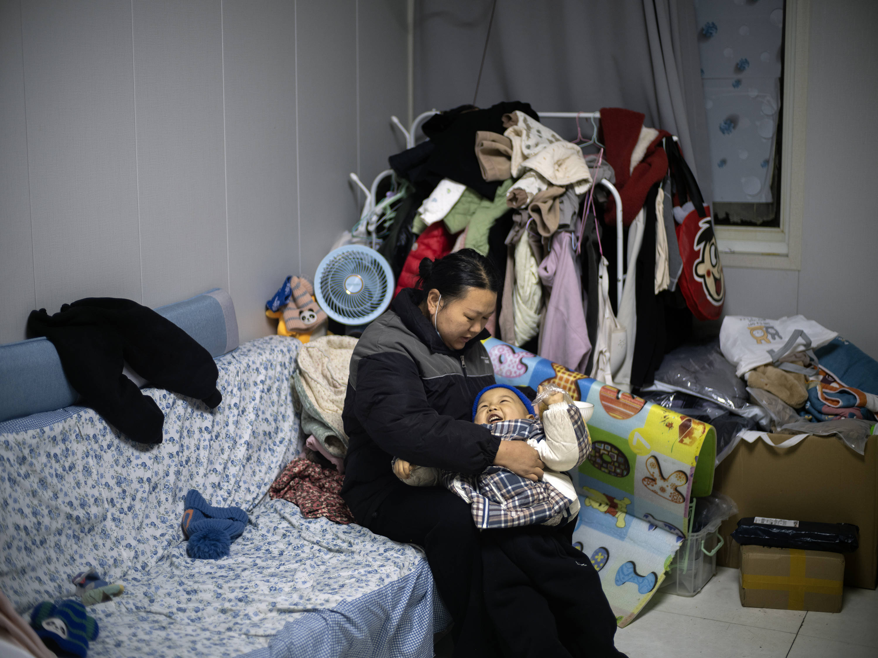 瀚邦妈妈在出租屋里陪孩子玩。
