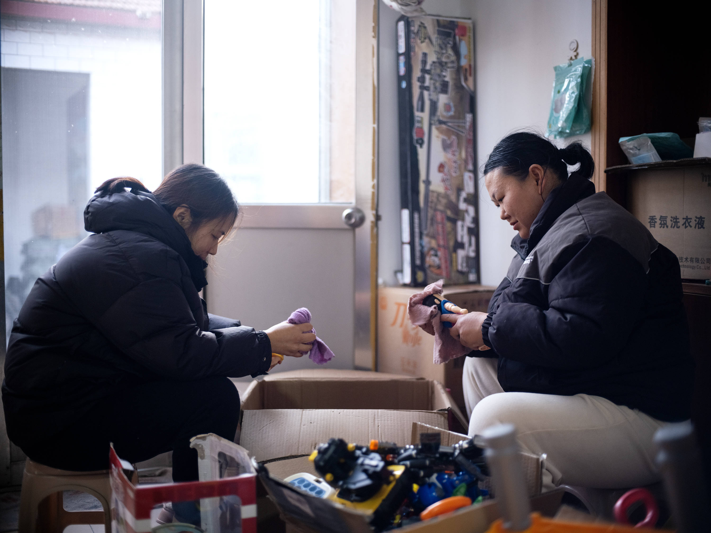 瀚邦妈(右)和大宝妈整理孩子们的玩具。