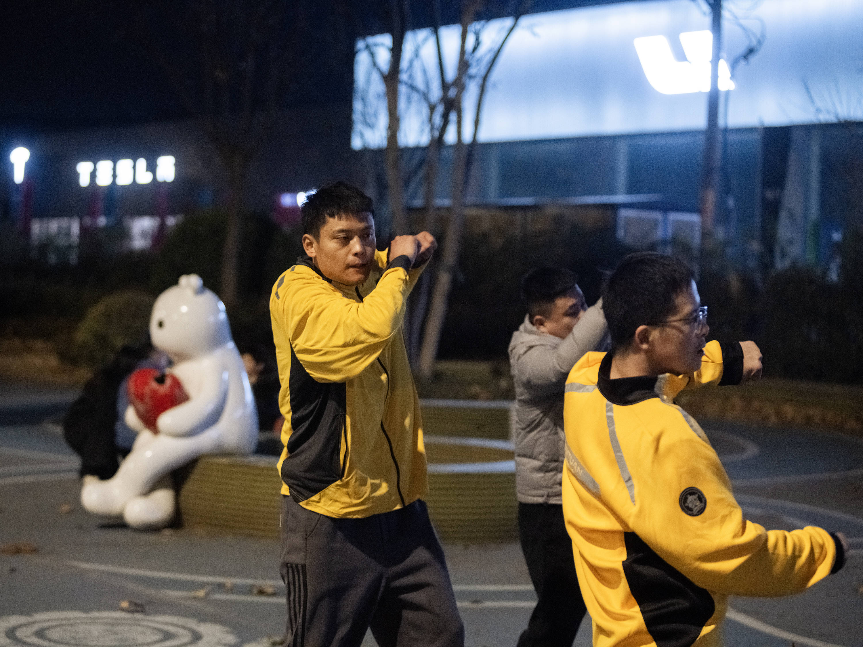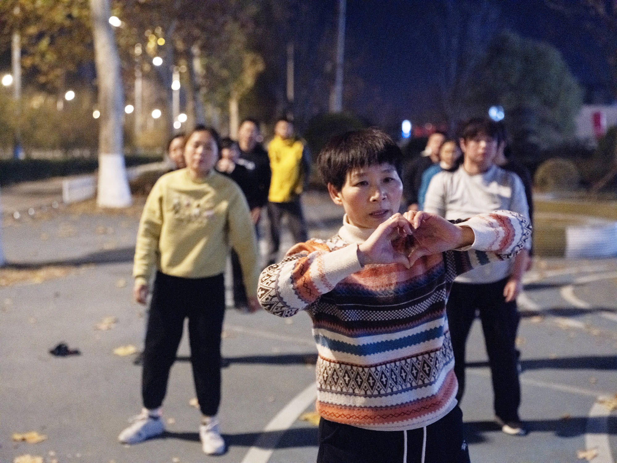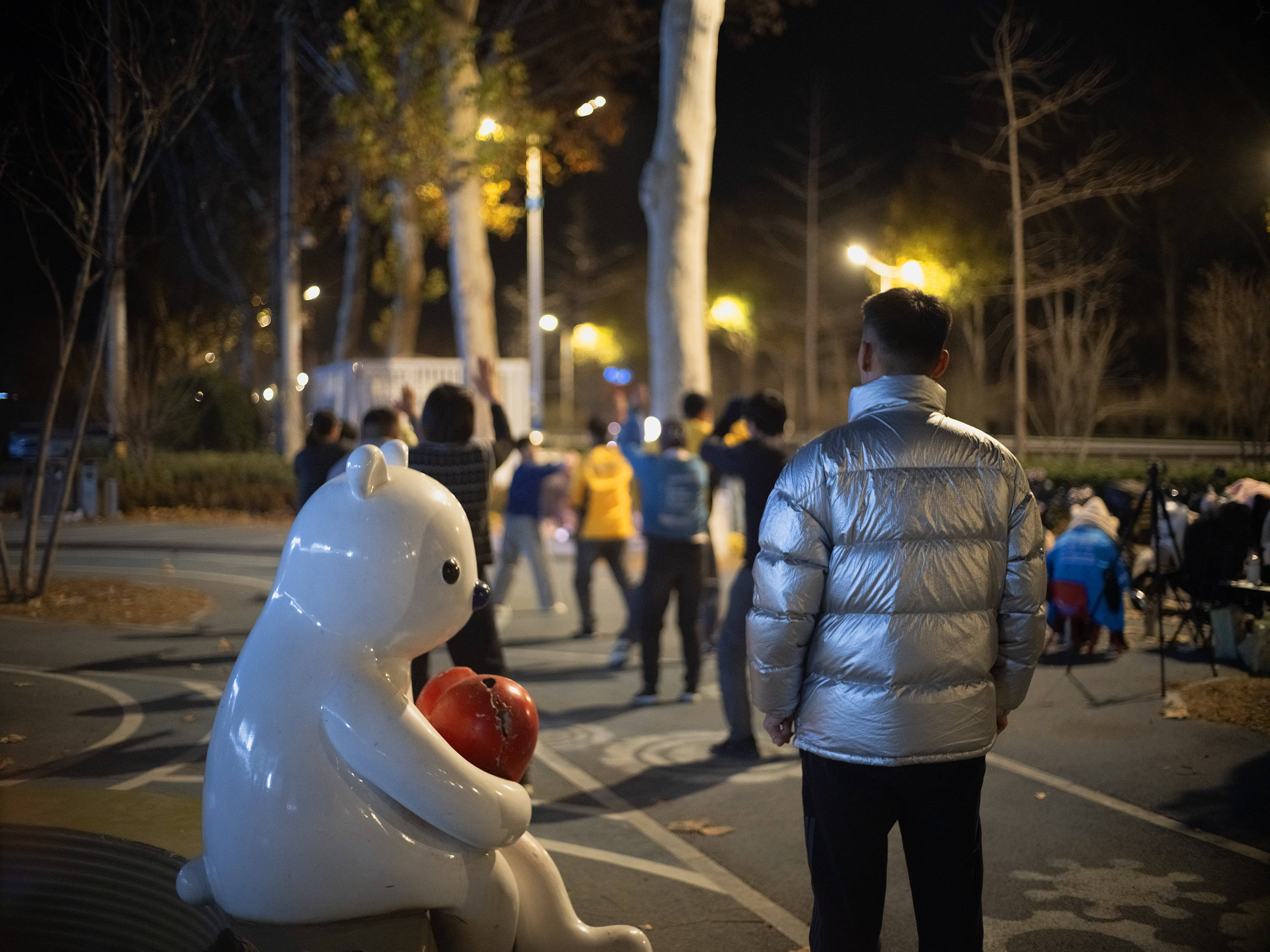 跳舞场地离山肿两公里,在国道旁边的小广场,广场上有一个抱着红心的小熊。室外温度已经零度以下了,但直播的效果会更好,大家更爱看户外。我们得把外套脱了,要不太笨重。外套一脱,必须马上热身,慢一点,人就冻透了。跳到浑身冒汗,汗一湿,冷风一打,衣服能冻硬。