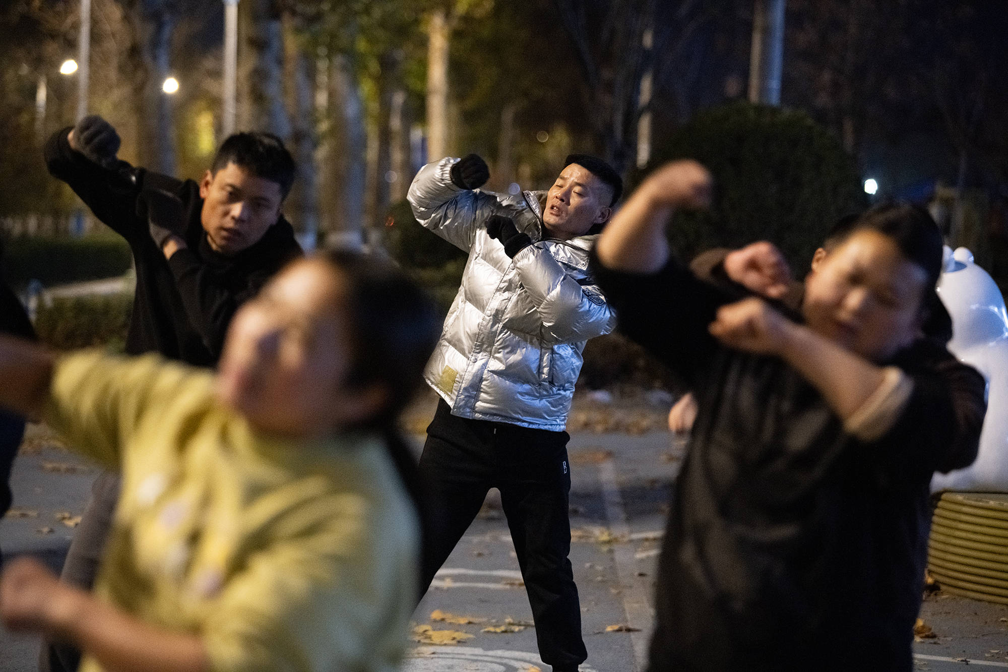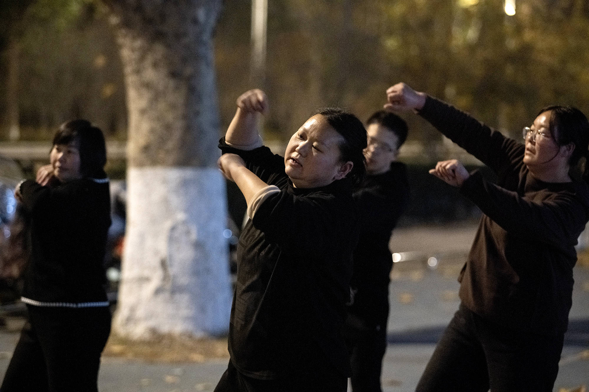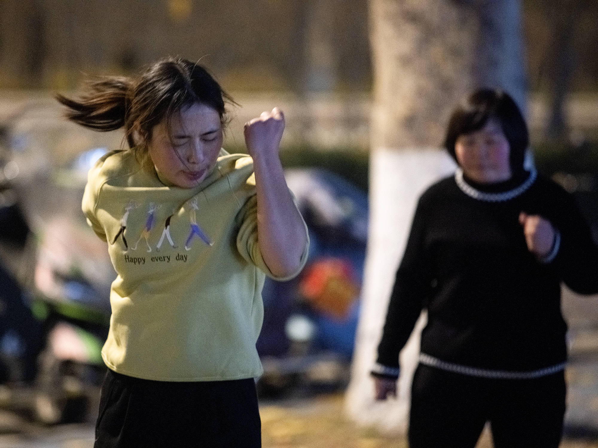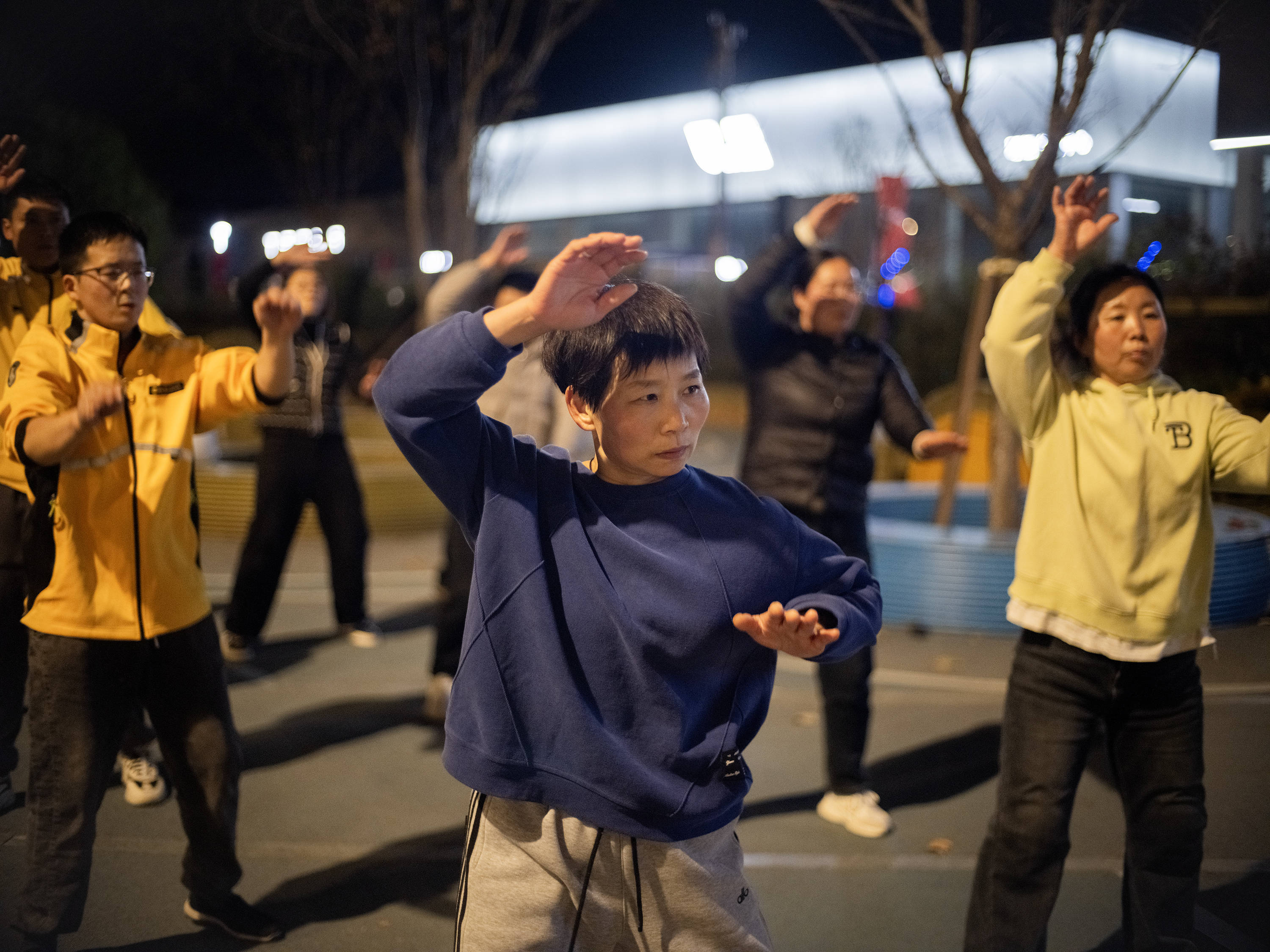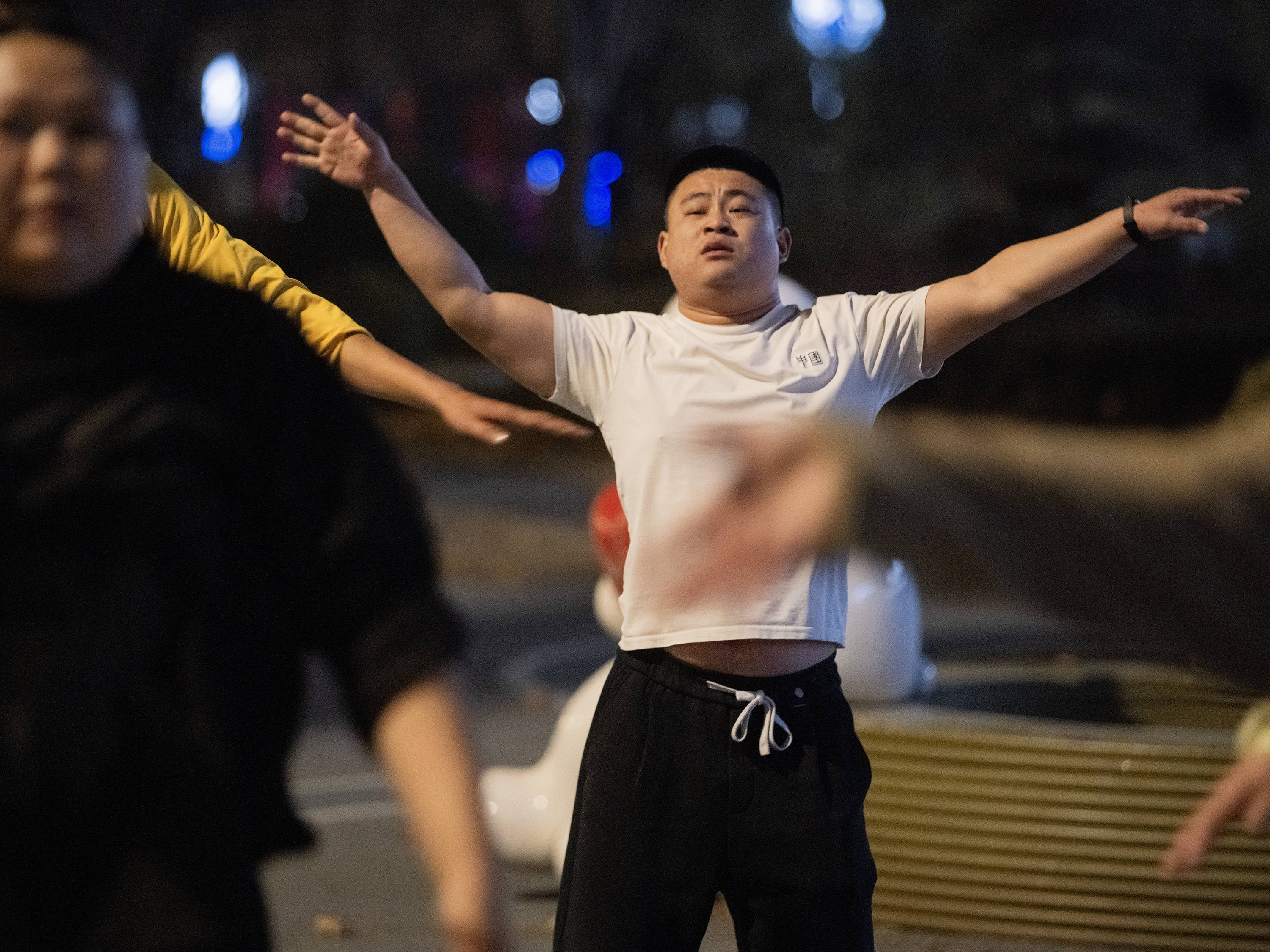 还有一个动作是单脚支撑,整个人的重量压在一条腿上,对膝盖和腰的磨损挺大的。开跳前,大家绑上护膝,贴着膏药,有的人还得提前吃止痛药顶着。跳到后面,胃里开始翻腾。夏天有个爸爸跳舞前吃得多,跳吐了,现在我们不敢吃太饱。