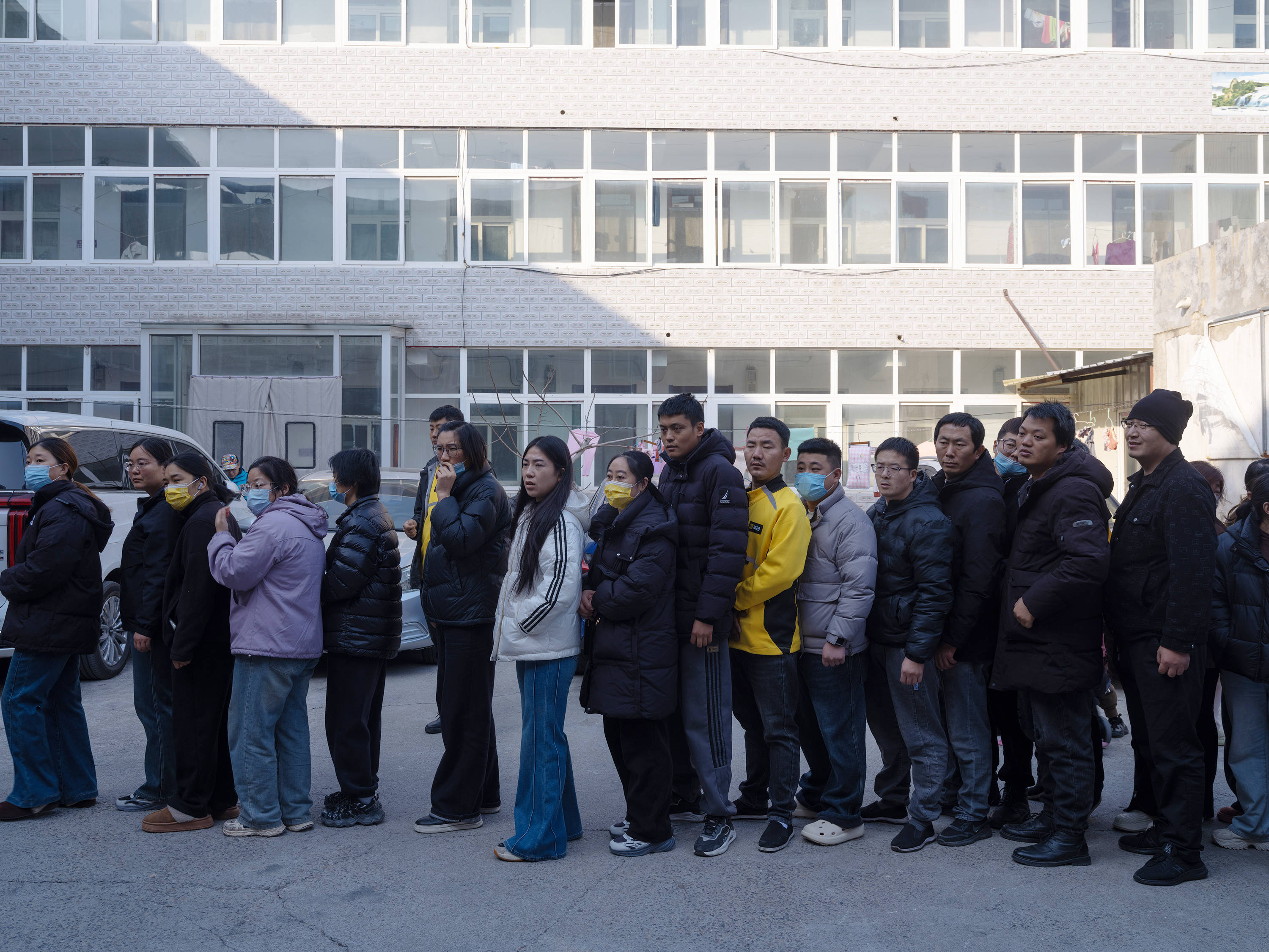 慈善机构来探望,父母们排队领物资。