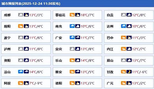 四川气象台预计,25日白天到晚上,广元、巴中、南充、广安4市部分地方和绵阳市东部、达州市西部阴天有小雨或零星小雨,高海拔山区有雨夹雪或小雪,盆地其余地方以阴天间多云天气为主,阿坝州中部南部、甘孜州东部和攀西地区大部多云间阴有分散阵雪(雨),川西高原其余地方多云间晴。