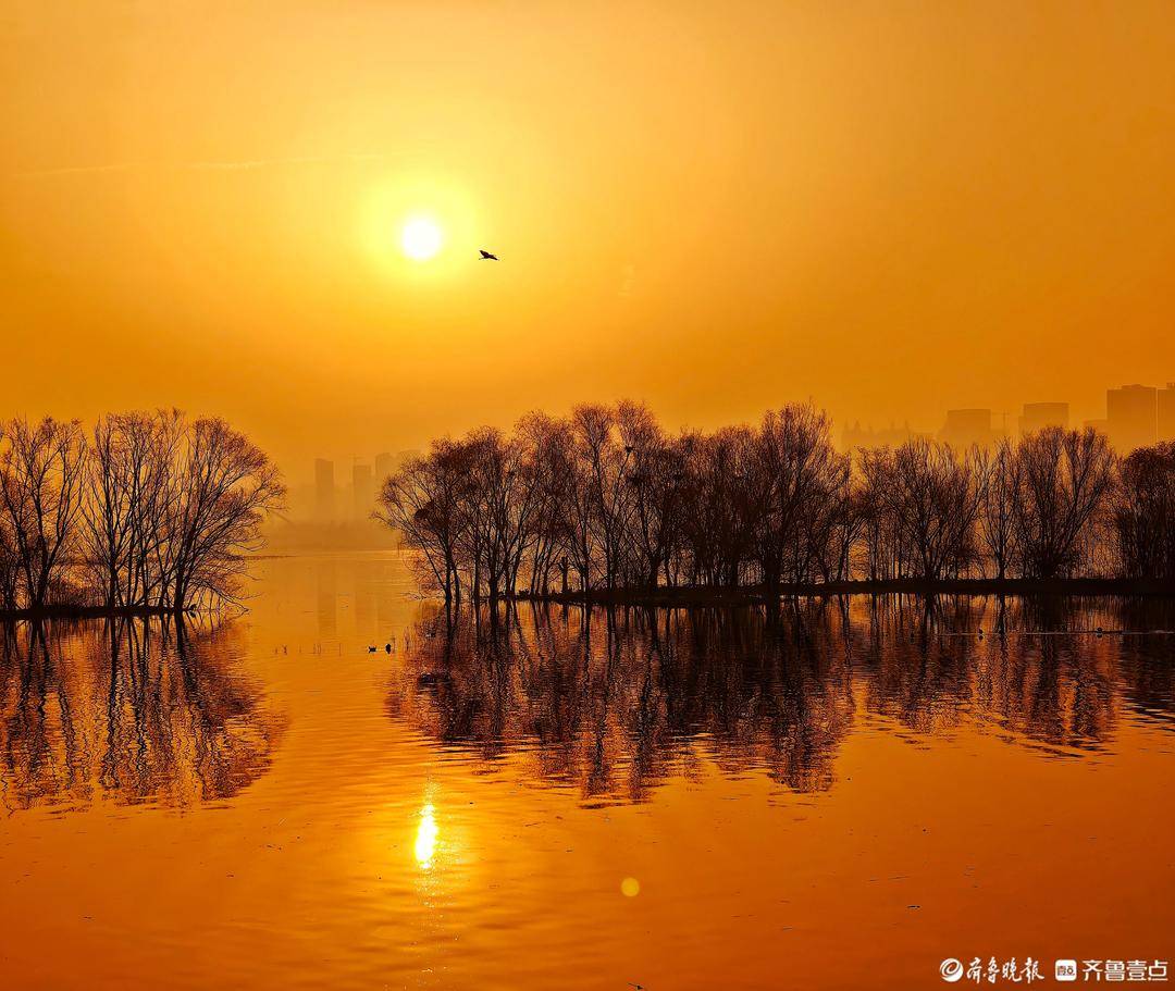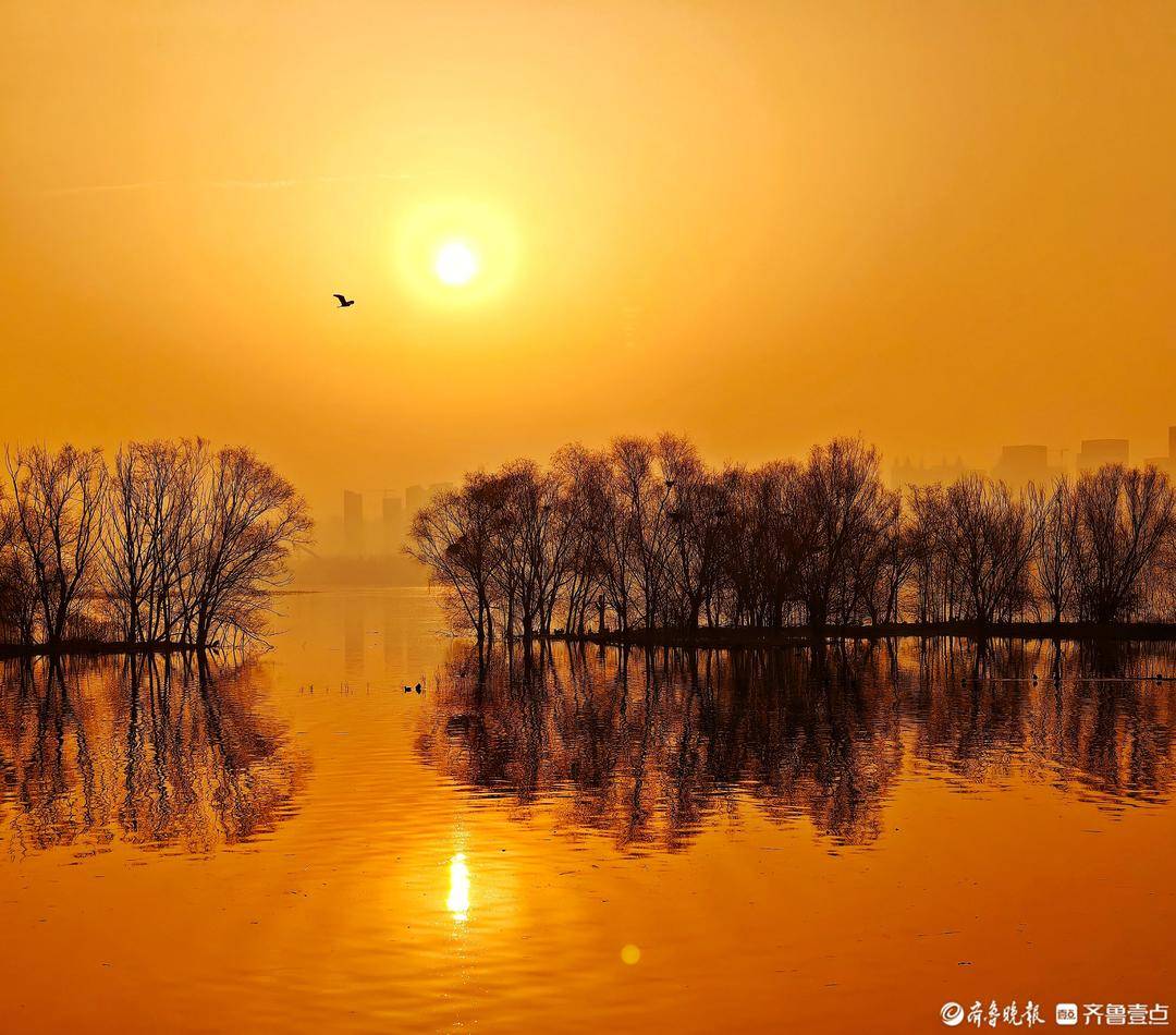 河南三门峡天鹅湖,太阳升起鸟儿飞