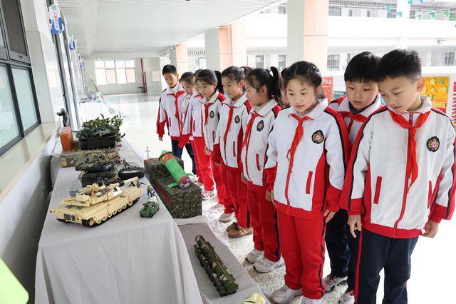 活动现场,各年级成果亮点纷呈:二年级学子通过故事宣讲会的形式,生动再现革命先辈的英雄事迹,以稚嫩的声音传递着对革命先辈的崇敬之情;三年级以“为红色藏品代言”为核心,整合多学科资源,学生通过小组合作,制作“少年追红·藏物叙史”手工作品展,探寻红色藏品背后的精神密码;四年级的“伟人成长研究社”成果丰硕,同学们化身小研究员,将伟人生平与精神品质转化为图文并茂的《伟人成长手册》,在主动探究中感悟榜样力量;五年级的国防科技探索成果令人瞩目,学生们追溯新型武器发展脉络,亲手制作的武器模型与精心设计的涵盖海、陆、空以及无人作战领域的科普展,彰显着对“强国重器”的探索热情,让爱国情怀融入实践创造;六年级的“未来守护者职业博览会”独具匠心,学生通过现场复原设计图、搭建未来工作场景等形式,展现对未来职业的思考,建立个人与国家的关联认知,完成国防意识与职业启蒙的双重成长,凸显了新时代好少年的责任与担当。