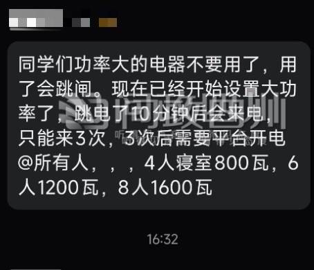 公开资料显示,多所高校限制学生宿舍使用大功率电器。如湖北一高校限制使用单个功率在800W以上电器,限电后不影响照明、电脑等正常学习和生活用电。河南某高校规定单个宿舍总用电功率不超过1500瓦。等等。