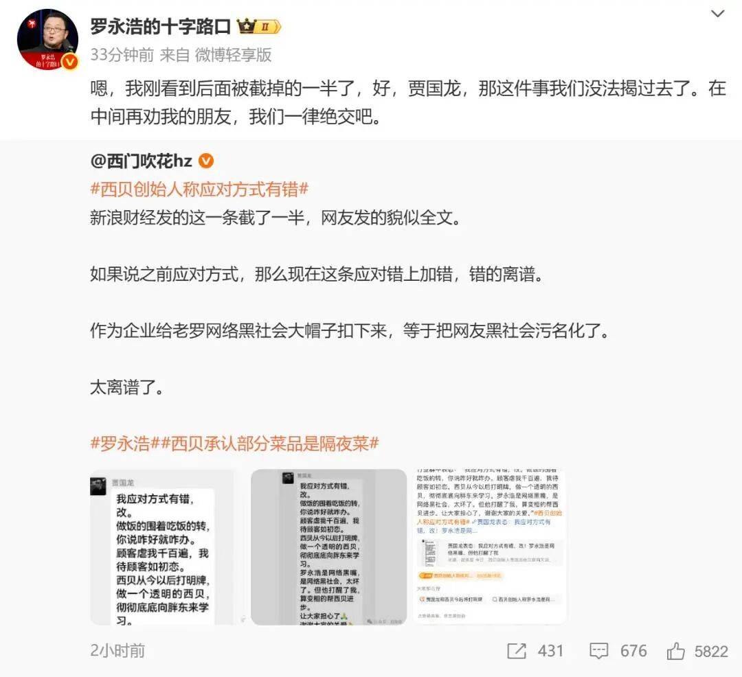 对于被西贝创始人贾国龙称为“网络黑嘴”“网络黑社会”,罗永浩发文称“好,贾国龙,那这件事我们没法揭过去了。在中间再劝我的朋友,我们一律绝交吧”。