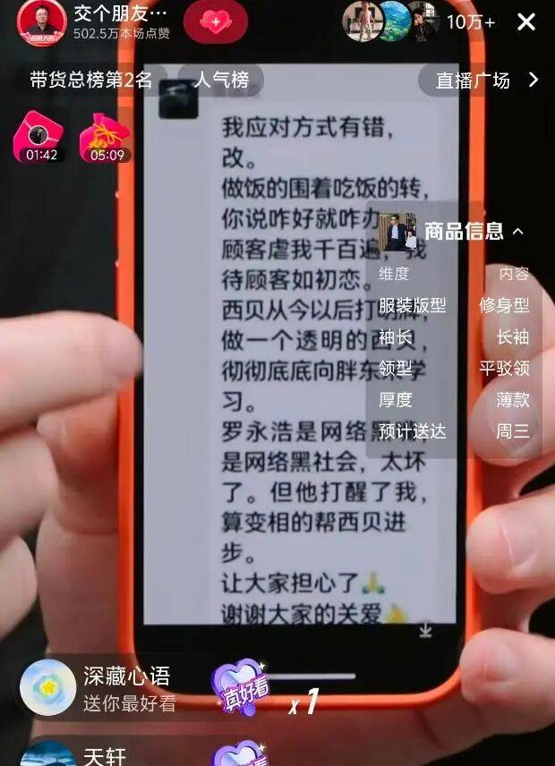 此前,罗永浩反映西贝餐饮“几乎都是预制菜”,西贝发布公开信称罗永浩指责不实,向全社会开放后厨,顾客在穿戴相关食安防护服装符合食品安全要求的前提下,可参观后厨。
