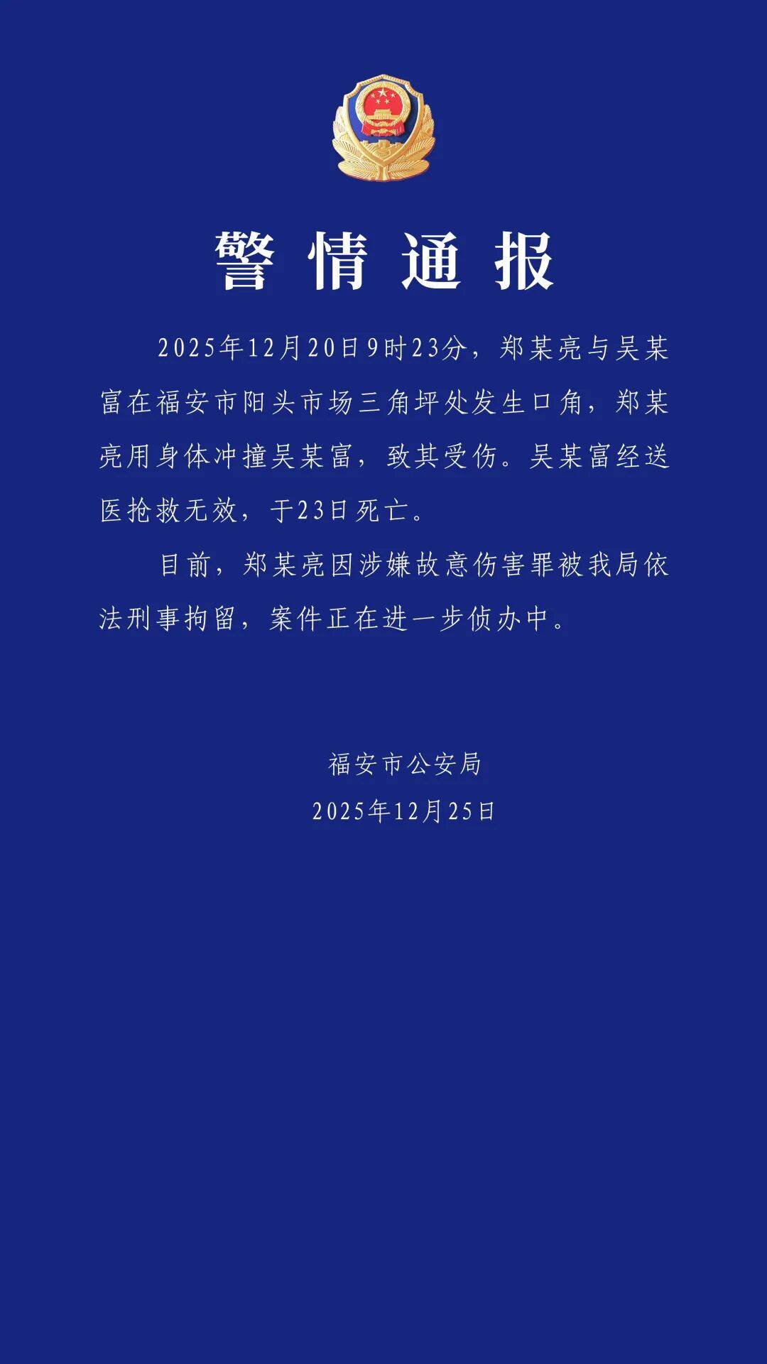 2025年12月20日9时23分,郑某亮与吴某富在福安市阳头市场三角坪处发生口角,郑某亮用身体冲撞吴某富,致其受伤。吴某富经送医抢救无效,于23日死亡。