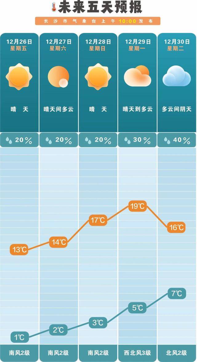 记者注意到,接下来长沙气温缓慢回升,下雪暂时还有点遥远。根据预报,从12月26日开始长沙将迎来一连串的晴好天气。其中,12月26日(周五)为晴天,气温1℃至13℃;12月27日(周六)晴天间多云,2℃至14℃;12月28日(周日)持续晴天,气温继续上升,3℃至17℃;12月29日(下周一)最高气温更是攀升至19℃,体感明显转暖。不过,需关注的是,早晚气温仍偏低,在1℃至5℃之间,昼夜温差均超过10℃。