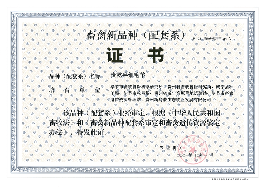 备注:国审5个新品种(审定“贵乾半细毛羊”1个羊新品种、登记“毕薯8号”“毕薯9号”2个马铃薯、鉴定“黔芸豆2号”“黔芸豆3号”2个食用豆),省审10个品种(“毕单999”“毕青111”“毕科玉1号”“毕科玉2号”“毕农玉25”“5个玉米”、“毕粳47号”“毕粳48号”“毕粳优8号”3个水稻、“赫麻芋1号”“赫麻芋2号”2个半夏品种),培育“贵乾1号”“贵乾2号”2个畜禽新品系。成功转让了“毕单23”“毕单999”“毕科玉1号”等3个新品种。