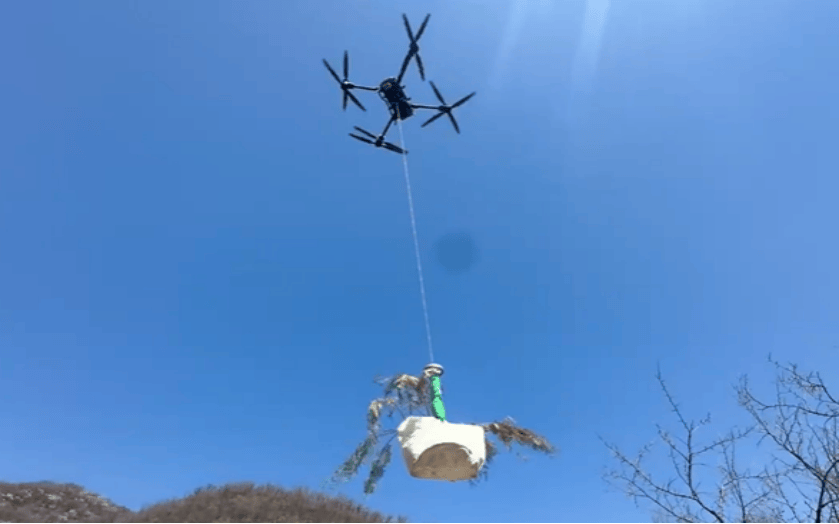 无人机在八达岭林场上空运送树苗。图源:北京市园林绿化局