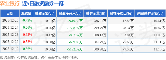 证券之星消息,截至2025年12月25日收盘,农业银行(601288)报收于7.58元,下跌0.79%,换手率0.06%,成交量177.74万手,成交额13.52亿元。