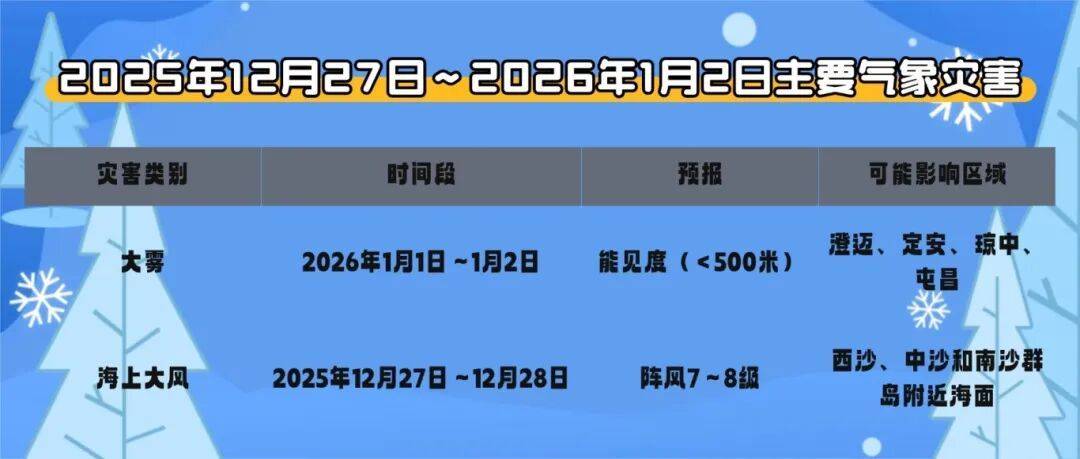 2025年12月27日~2026年1月2日,受弱冷空气影响,海南全岛以多云天气为主,其中东半部地区有分散小阵雨;另外,1月1日~2日,五指山以北地区局地早晚有雾。各地最高气温缓慢回升,五指山以北地区可升至24~27℃,五指山以南地区27~29℃;最低气温中部山区和西部内陆地区13~16℃,其余地区16~19℃。