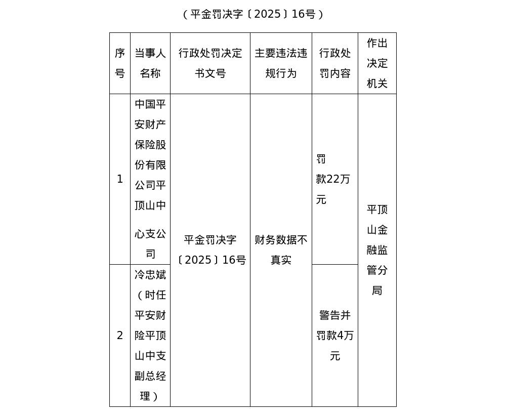 罚单显示,中国平安财产保险股份有限公司平顶山中心支公司的主要违法违规事实(案由)为:财务数据不真实。