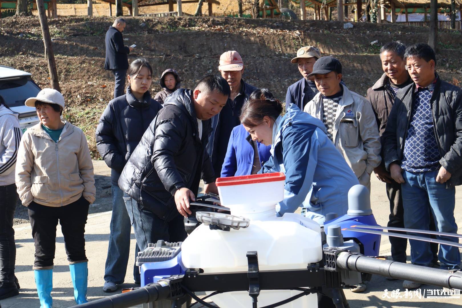 12月6日,杨梅(前右)正在进行无人机操作演示。(曾田 摄)