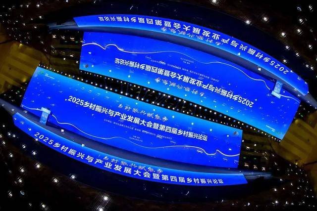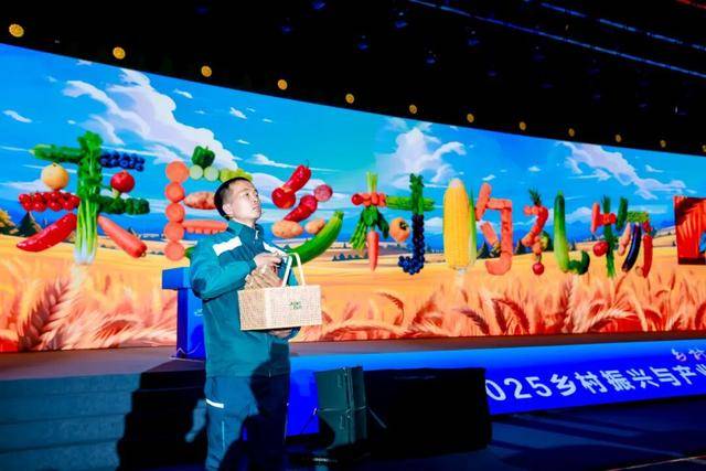 2025乡村振兴与产业发展大会主论坛现场,快递员派送来自乡村的礼物。