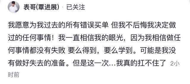 “我愿意为过去的所有错误买单,但我不后悔我决定做过的任何事情,我一直相信我的眼光,因我而我相信做任何事情都没有失败,要么得到,要么学到,可能是我没有做好失去的准备,但是这一次,我真的扛不住了。”
