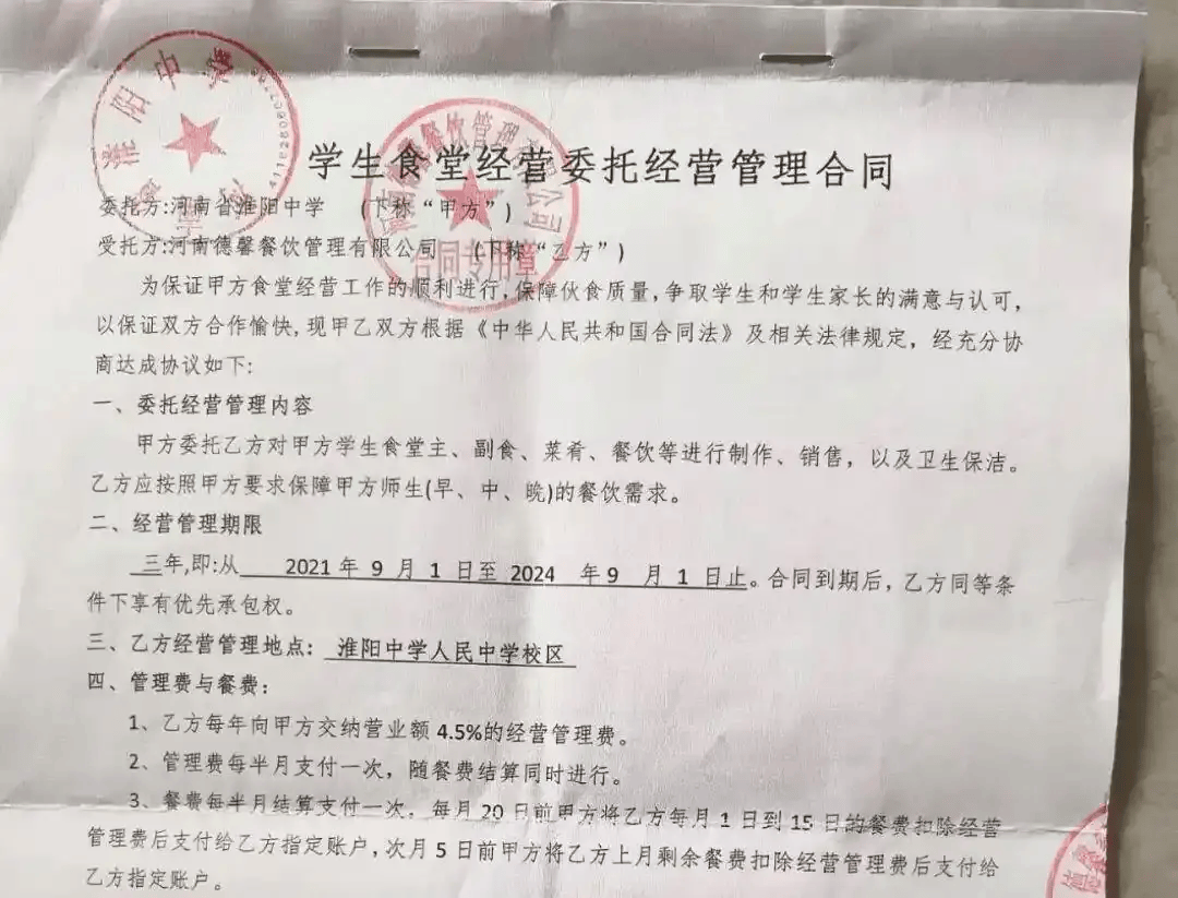 12月25日,淮阳中学现任党委书记徐良回应称,2022年9月份之前,学校是按照合同约定收取德馨餐饮公司营业额的4.5%作为管理费,但9月份后,教育部等下发文件明确要求,中小学校食堂应当坚持公益性和非营利性原则,学校就取消了“经理管理费”,不再收取任何费用。
