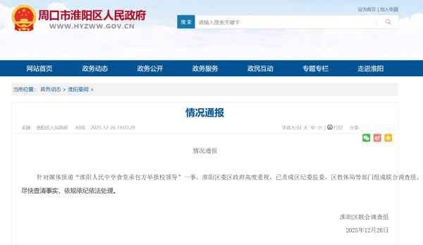 针对媒体报道“淮阳人民中学食堂承包方举报校领导”一事,淮阳区委区政府高度重视,已责成区纪委监委、区教体局等部门组成联合调查组,尽快查清事实,依规依纪依法处理。