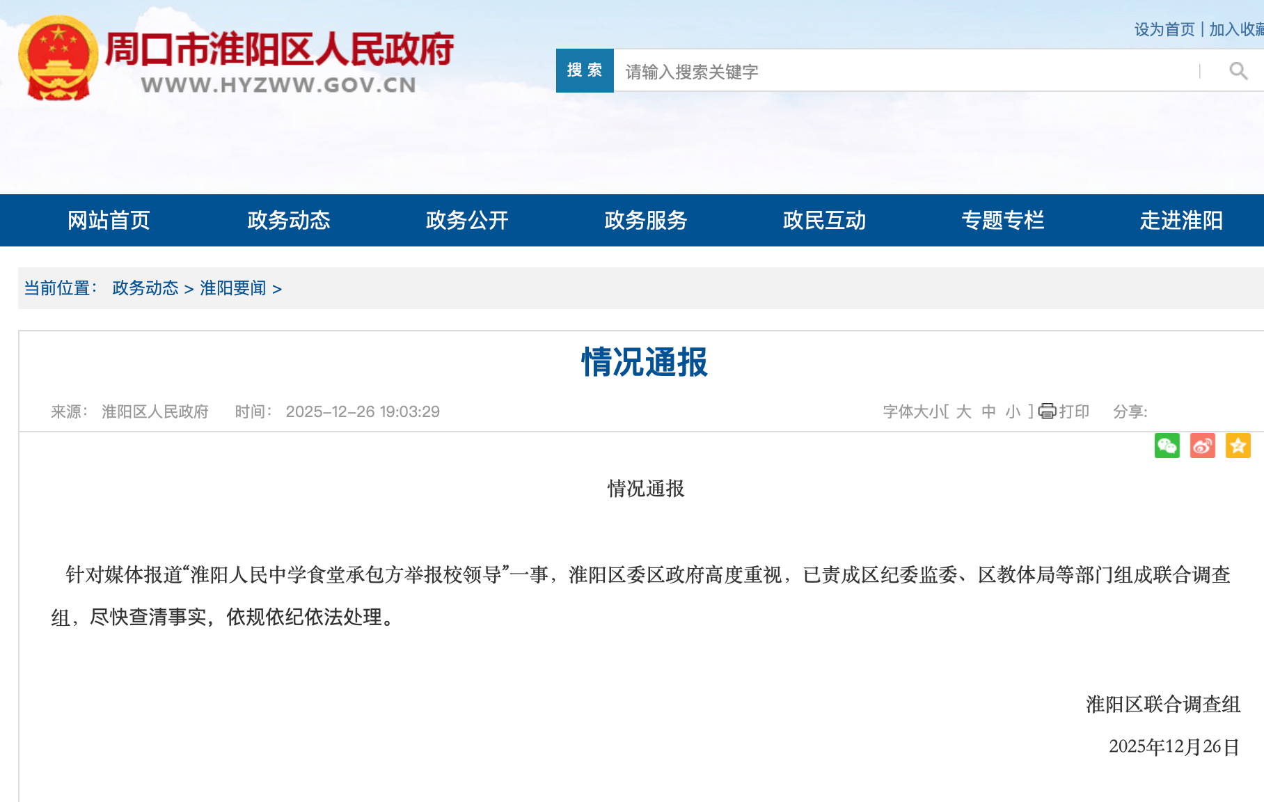 12月26日晚,淮阳区人民政府发布情况通报称:针对媒体报道“淮阳人民中学食堂承包方举报校领导”一事,淮阳区委区政府高度重视,已责成区纪委监委、区教体局等部门组成联合调查组,尽快查清事实,依规依纪依法处理。