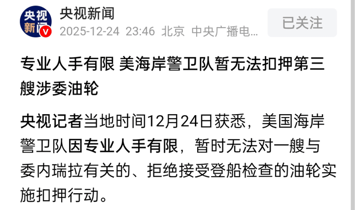 消息来源:《央视网》12月25日报道《美海岸警卫队人手不足,暂难扣押涉委内瑞拉油轮》