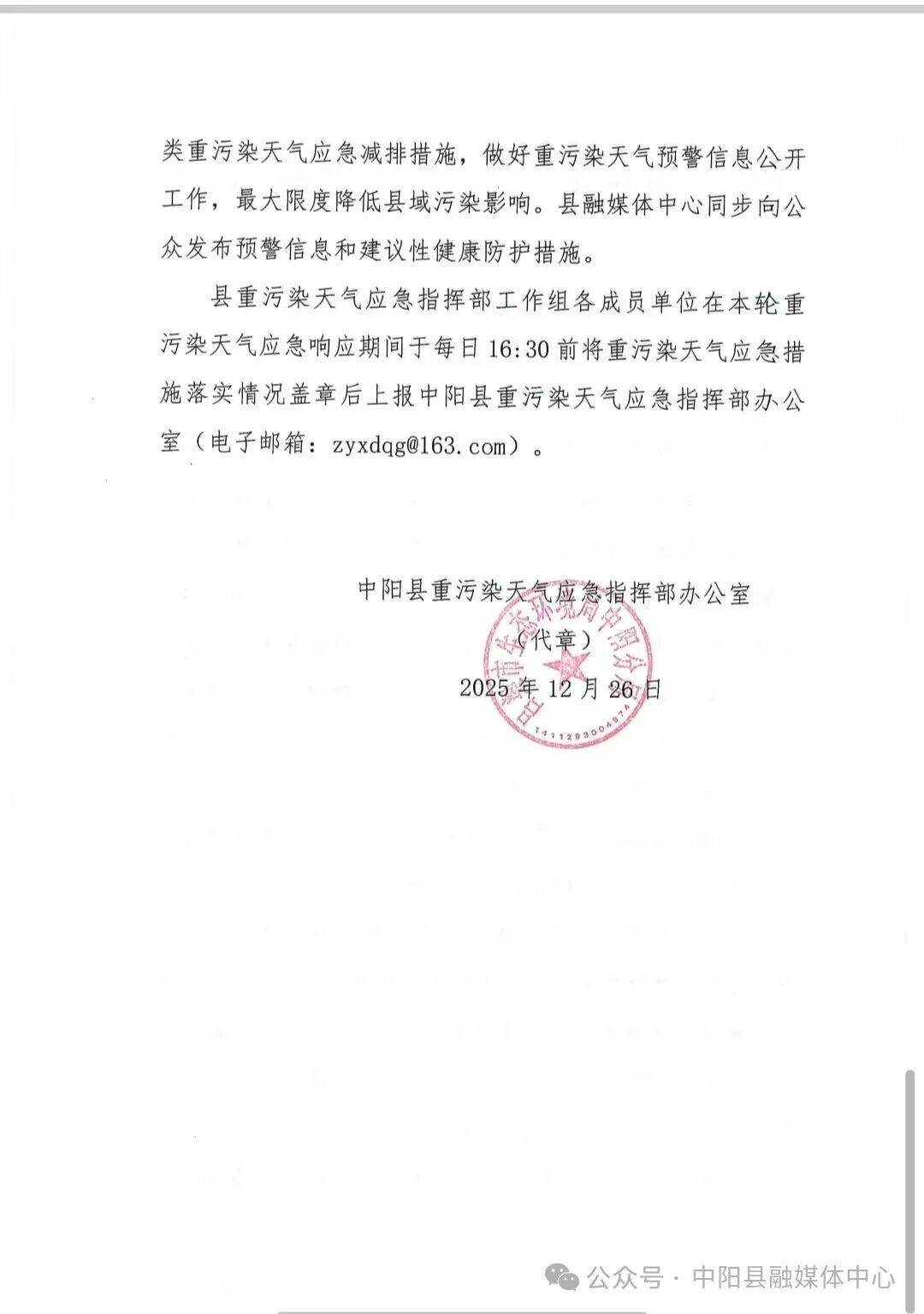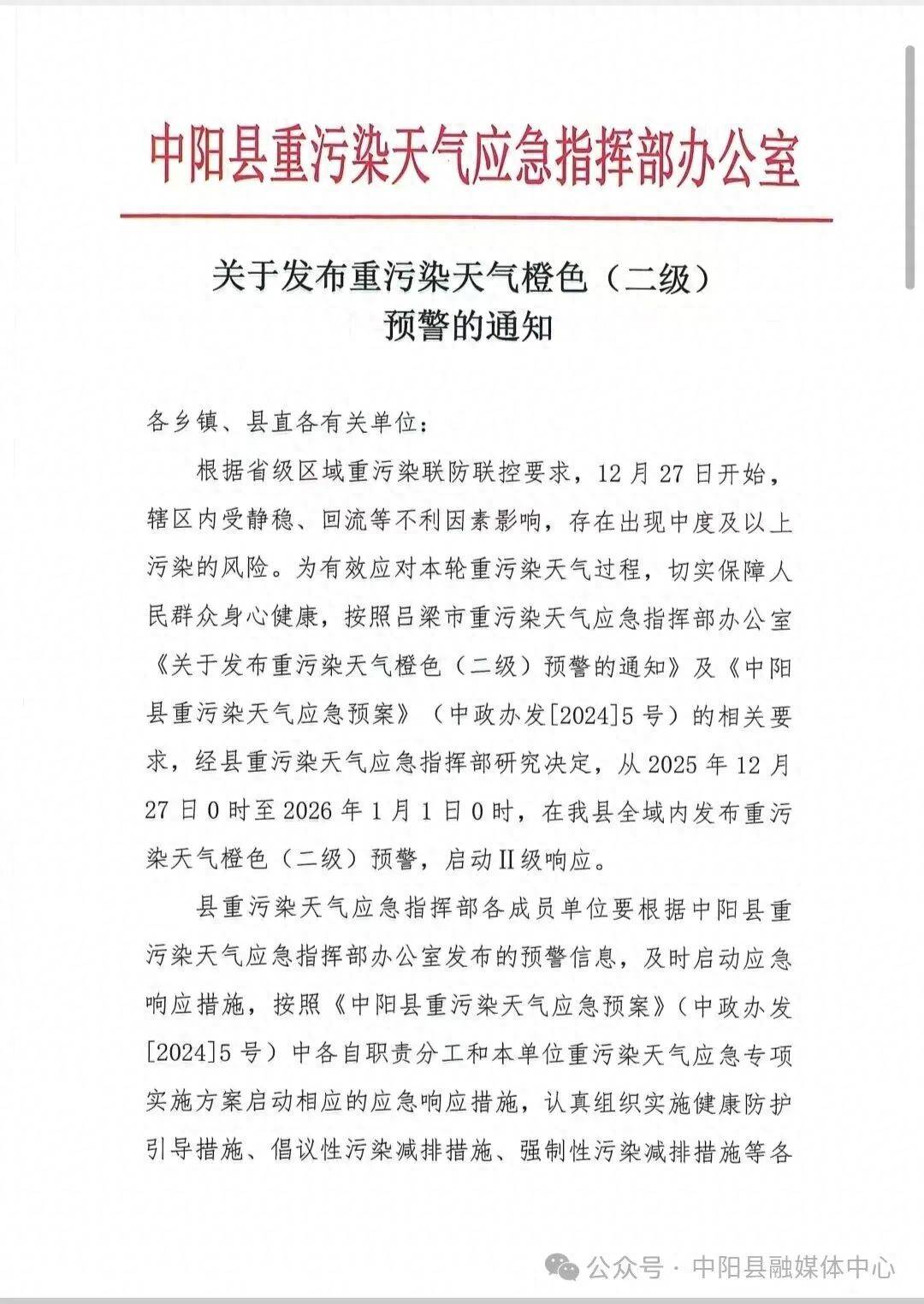 中阳:关于发布重污染天气橙色(二级)预警的通知