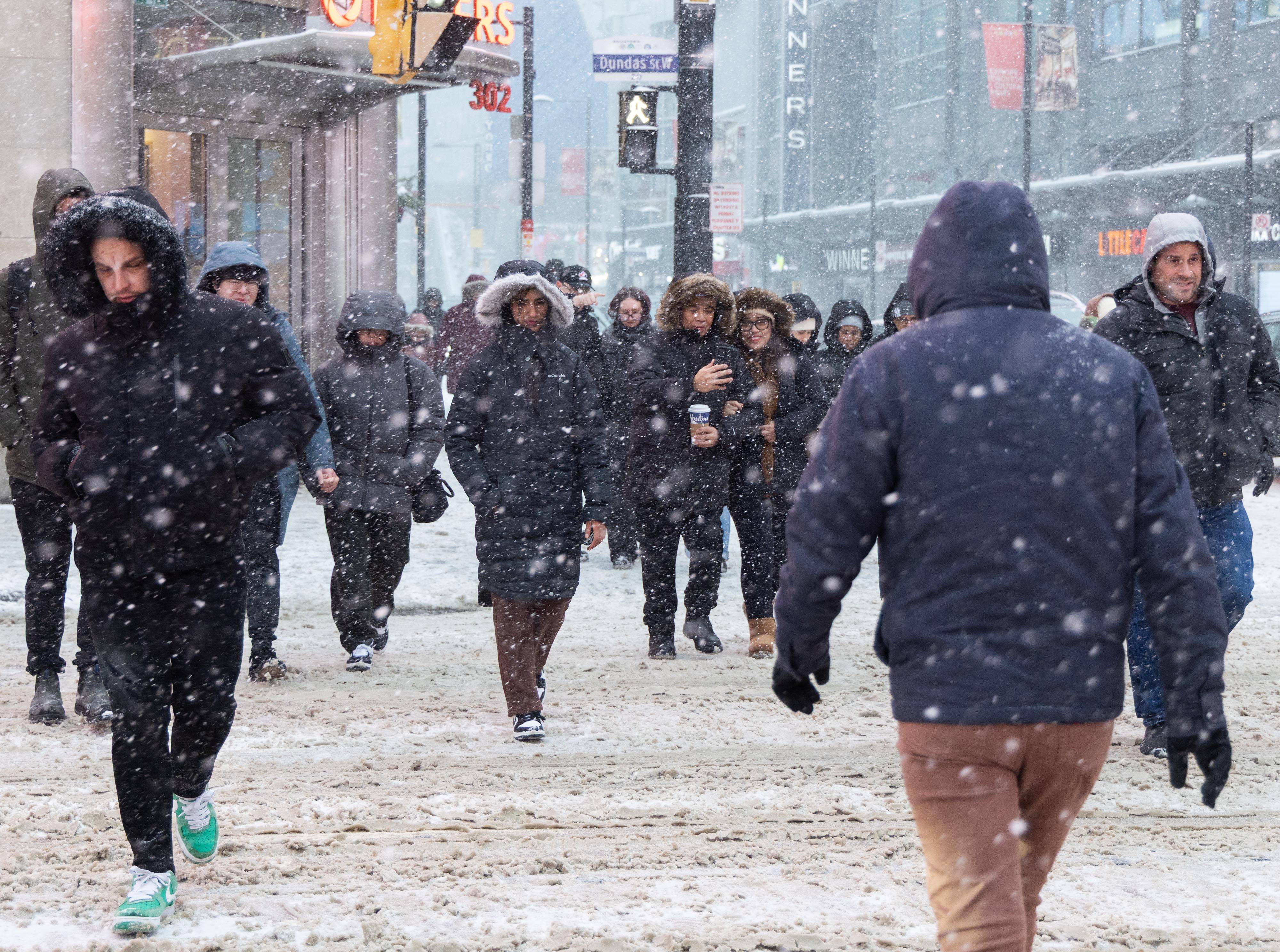 12月26日,在加拿大多伦多,人们在风雪中出行。 新华社发(邹峥摄)