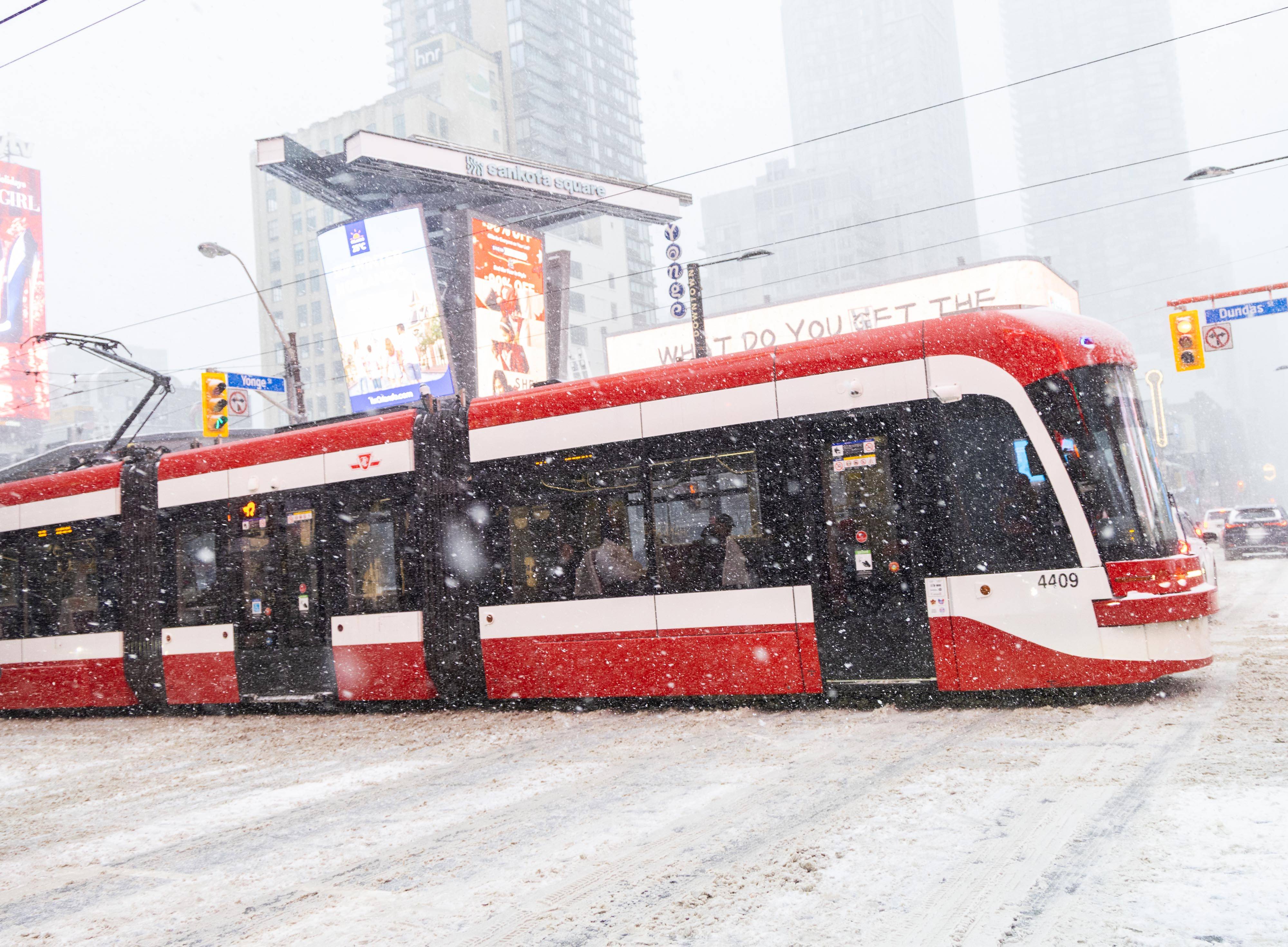 12月26日,在加拿大多伦多,一辆有轨电车在风雪中行驶。 新华社发(邹峥摄)