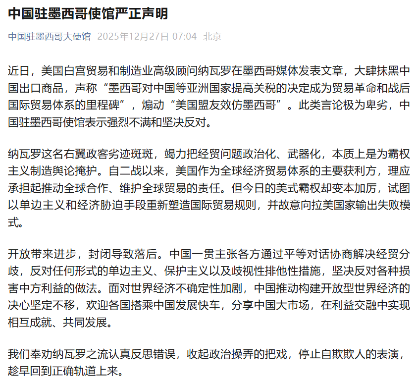 据中国驻墨西哥大使馆微信公众号消息,12月27日,中国驻墨西哥使馆发布严正声明: