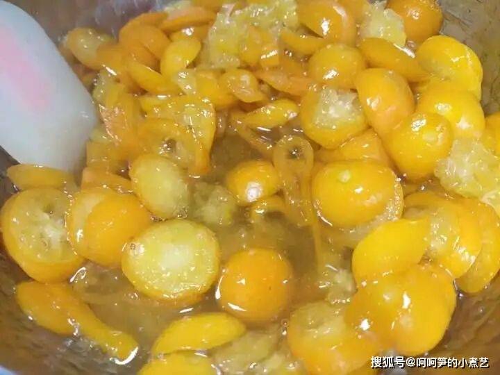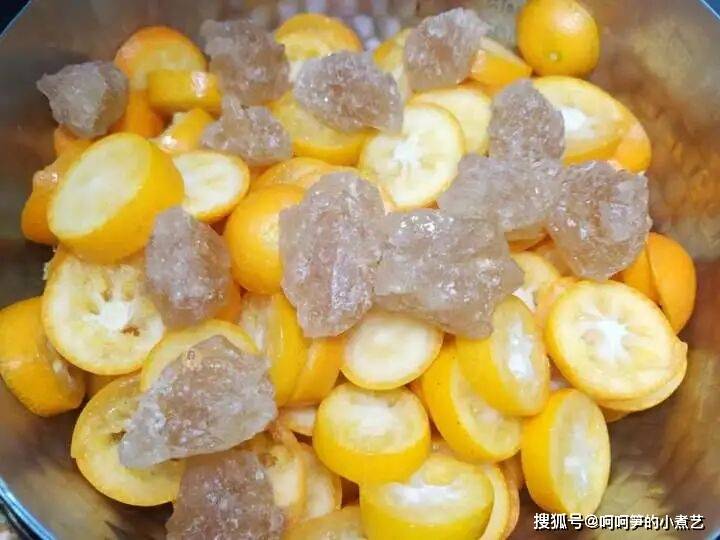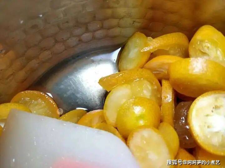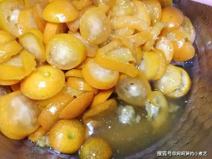 金桔里的黄冰糖部分融化后,金桔也析出汁水。