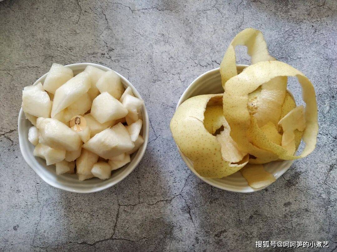 梨子用盐搓洗干净后削皮,果肉切成小块,梨子皮留着。