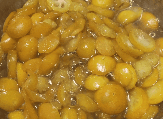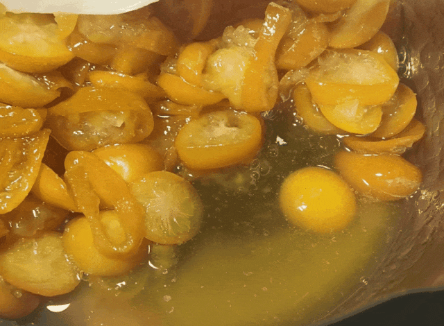 稍稍晾凉熬好的蜜渍金桔,金黄透亮,如果用刮刀触碰时会感觉有些硬,很结实。