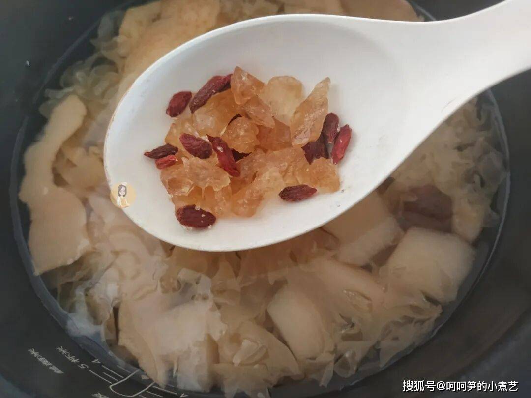再加入枸杞和冰糖焖10分钟,煮至冰糖完全融化即可。