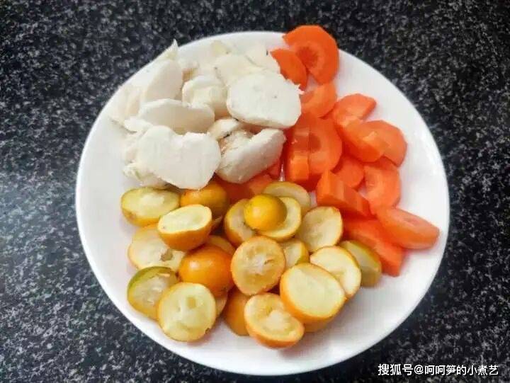 金桔用盐搓洗干净,对半切开并去籽。胡萝卜和马蹄去皮切块。
