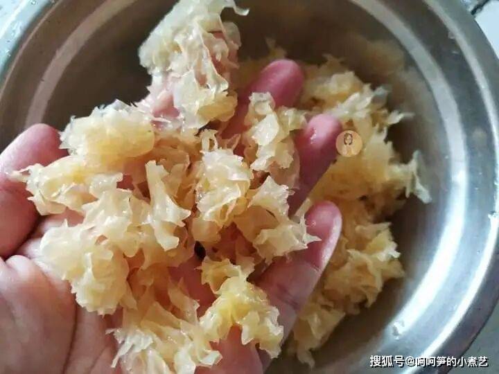 泡发后的银耳撕成小片,越小越容易出胶。