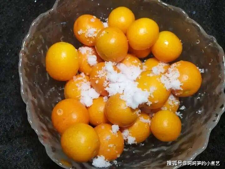 新鲜的金桔放入盆中,加盐,用双手将金桔的外皮反复搓洗干净,去掉表面的残留。