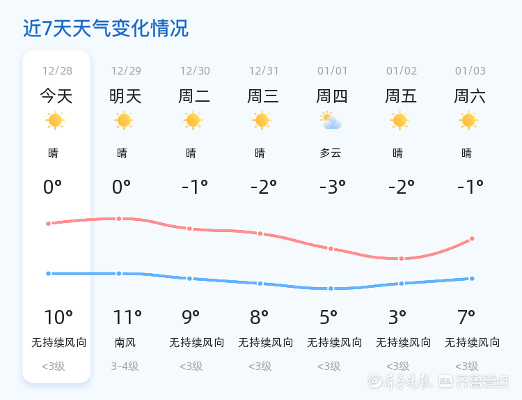 今天是2025年12月28日,星期日,农历十一月初九。济南市迎来晴好天气,气温适中,全市各区普遍晴朗,风力较小。今日最高气温10℃,最低气温0℃,当前温度3.6℃,南风2级,空气湿度59%,PM2.5指数102,空气质量良。