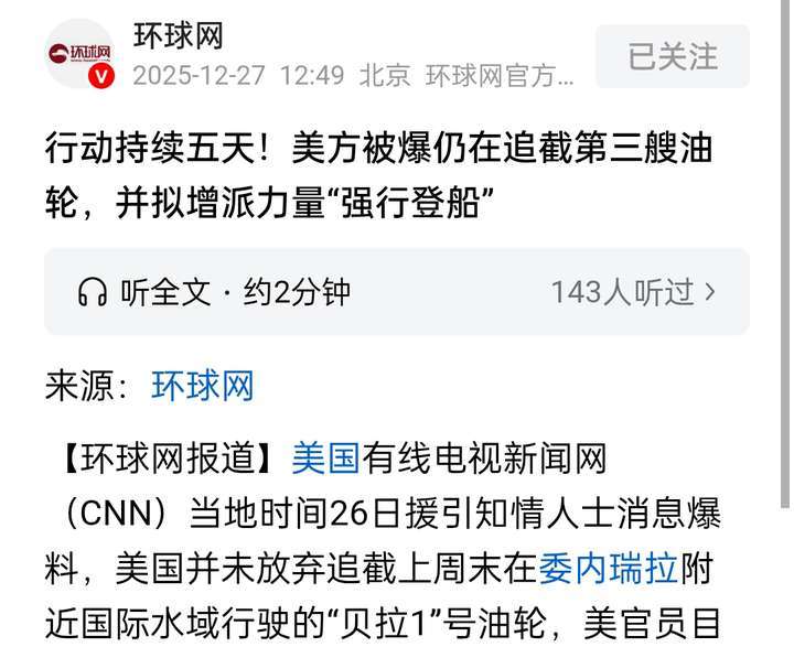 消息来源:环球网12月27日报道《行动持续五天!美方被爆仍在追截第三艘油轮,并拟增派力量“强行登船”》
