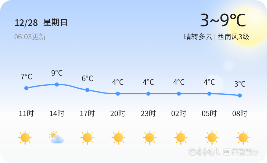 今天是2025年12月28日,星期日,农历十一月初九。烟台市今天天气晴转多云,气温在3℃至9℃之间,西南风3级,空气湿度为59%。空气质量状况为良好(PM2.5指数77),适合户外活动。市民出行时建议根据实时气温增减衣物,尤其是早晚温差较大,需注意保暖。