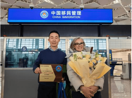 12月26日,郑州新郑国际机场国际航站楼内暖意融融。在郑州至意大利米兰HO1667次航班出境查验现场,定居上海的Sabrina女士(中文名:楚同心)接过郑州出入境边防检查站站长张怡送上的鲜花与纪念品,成为郑州航空口岸2025年度第100万名出入境旅客。