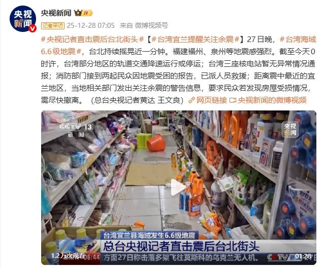 据@央视新闻消息,27日晚,台湾海域6.6级地震,台北持续摇晃近一分钟。福建福州、泉州等地震感强烈。截至今天0时许,台湾部分地区的轨道交通降速运行或停运;台湾三座核电站暂无异常情况通报;消防部门接到两起民众因地震受困的报告,已派人员救援;距离震中最近的宜兰地区,当地相关部门发出关注余震的警告信息,要求民众若发现房屋受损情况,需尽快撤离。(总台央视记者黄达 王文良)