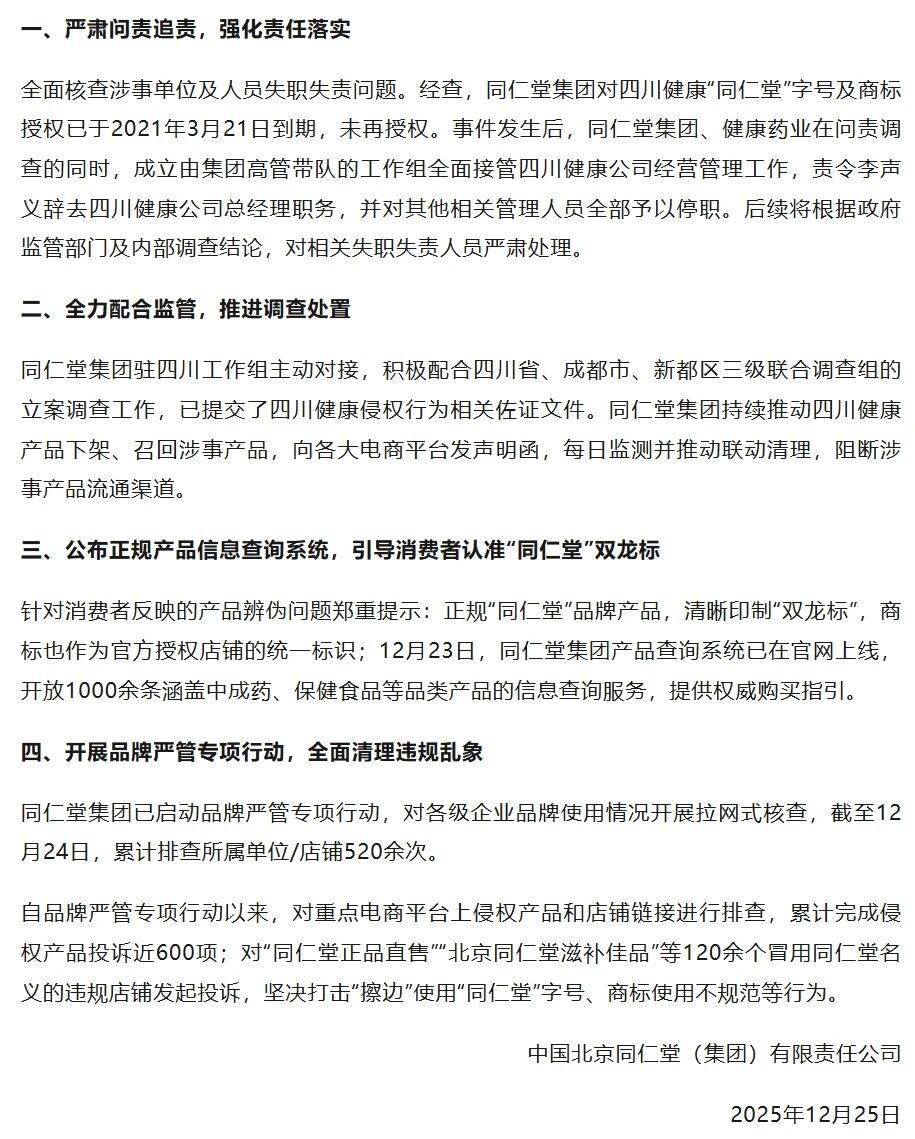 同日,同仁堂集团的整改动作频频,进一步厘清了与涉事企业的关系。集团声明明确,对四川健康药业的“同仁堂”字号及商标授权早在2021年3月21日就已到期,且未续期。此前的12月20日,集团已率先发布致歉声明,向消费者和社会各界表达歉意,并启动“零容忍品牌严管专项行动”,派专项工作组赴川全面核查涉事产品,责令四川健康药业立即下架相关产品。到了25日,整改力度再度升级:集团已派出高管带队的工作组全面接管四川健康药业的经营管理,不仅责令公司总经理李声义辞职,其余相关管理人员也全部停职,后续将依据监管结论和内部核查结果严肃追责。